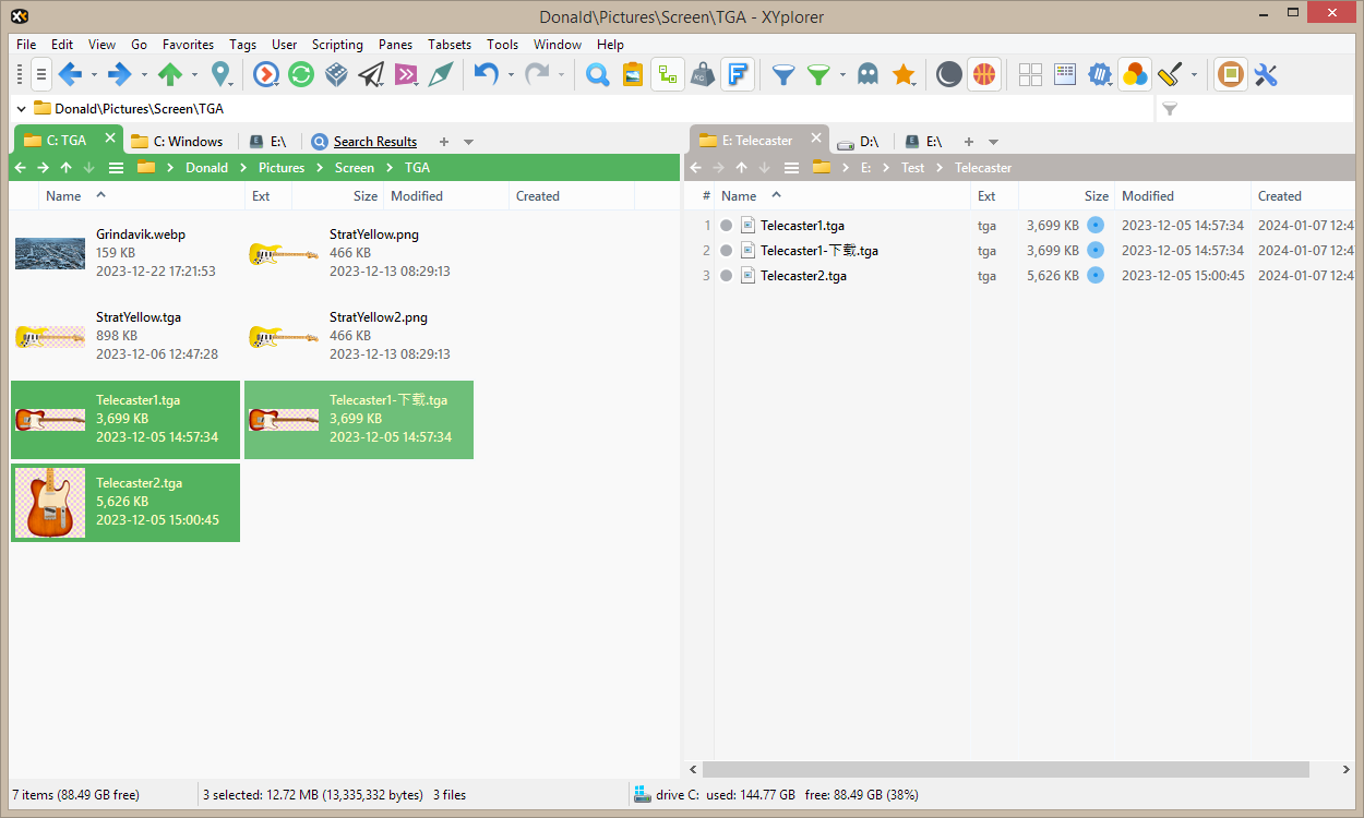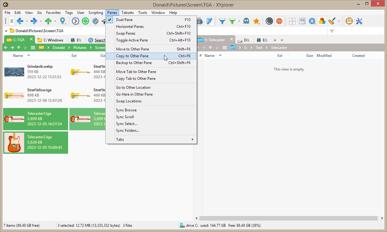 XYplorer 的双栏实现支持所有类型的窗格间文件操作,使用菜单、键盘或拖放。通常,您选择要移动或复制的项目,然后将它们拖到另一个窗格,放下后它们会立即出现。没有比这更简单的了。