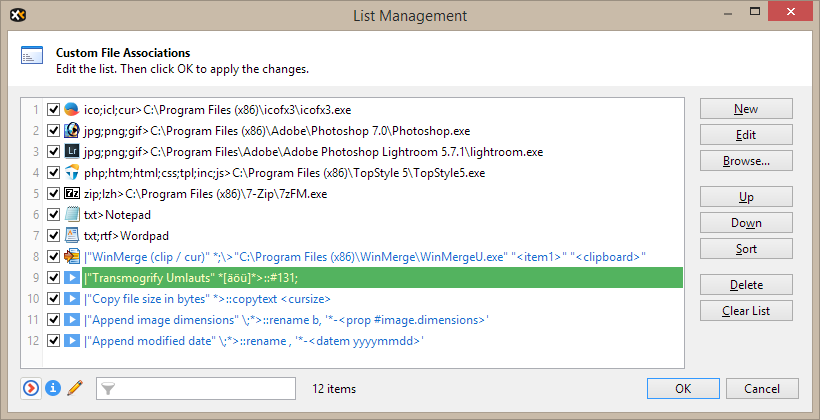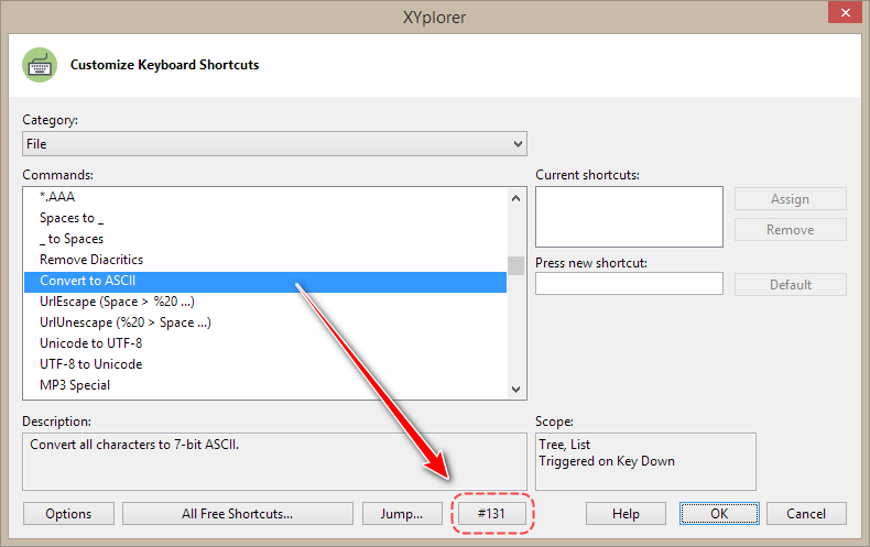 "Transmogrify Umlauts"是菜单项的标题。*[äöü]*是一个通配符模式,匹配名称中包含任何字符"äöüÄÖÜ"的所有文件项。>分隔模式和关联。::是 XYplorer 脚本标记,将关联项标识为脚本。#131;是关联的脚本——一个指向原生 XYplorer 功能的命令 ID,即 文件 | 重命名特殊 | 转换为 ASCII。