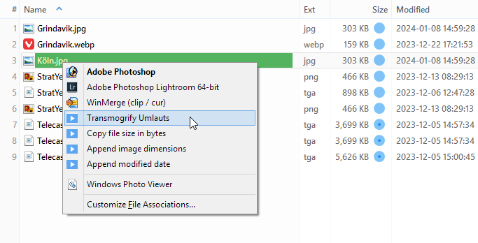 假设您的软件不喜欢德语元音变音,但您有时会在文件名中遇到,例如"Köln.jpg"。现在您想快速将其重命名为"Koeln.jpg"。
