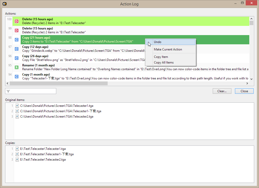 XYplorer 为移动、复制、重命名、删除和新建等文件操作提供多级撤销/重做功能。最多记录 256 个用户操作,可在任何时候撤销。操作甚至在会话之间保留,所以您今天就能修复昨天犯的错误——只需一次点击。