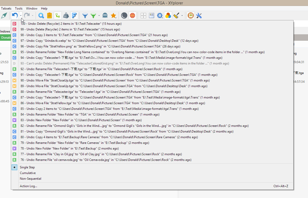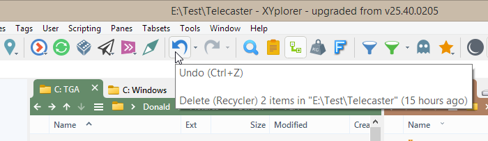 当事情出错时,撤销是您的好朋友。撤销的一个典型用途是当您将某些项目拖放到了错误的文件夹——可能是手指一滑,即著名的意外拖放。您甚至可能不知道是哪个文件夹。有了撤销功能,一次点击就能恢复一切。即使是第二天早上关闭并重启 XYplorer 之后也没问题。